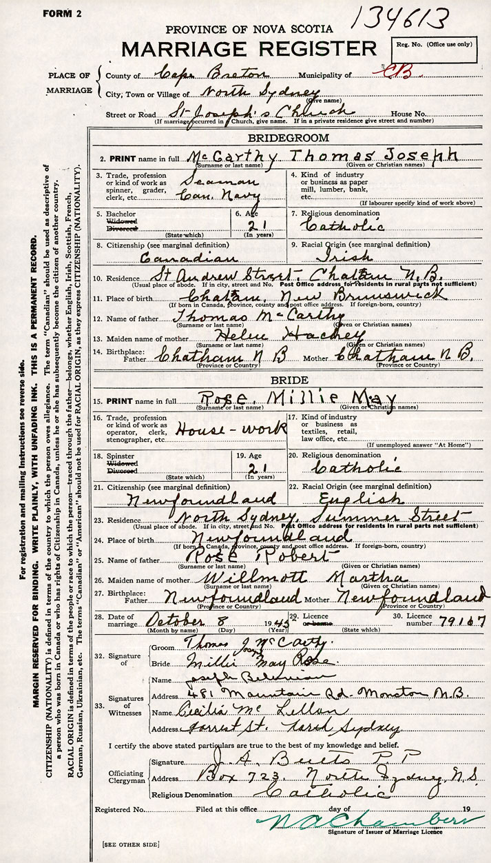 Note: groom's mother born Chatham, NB; bride's mother born Newfoundland