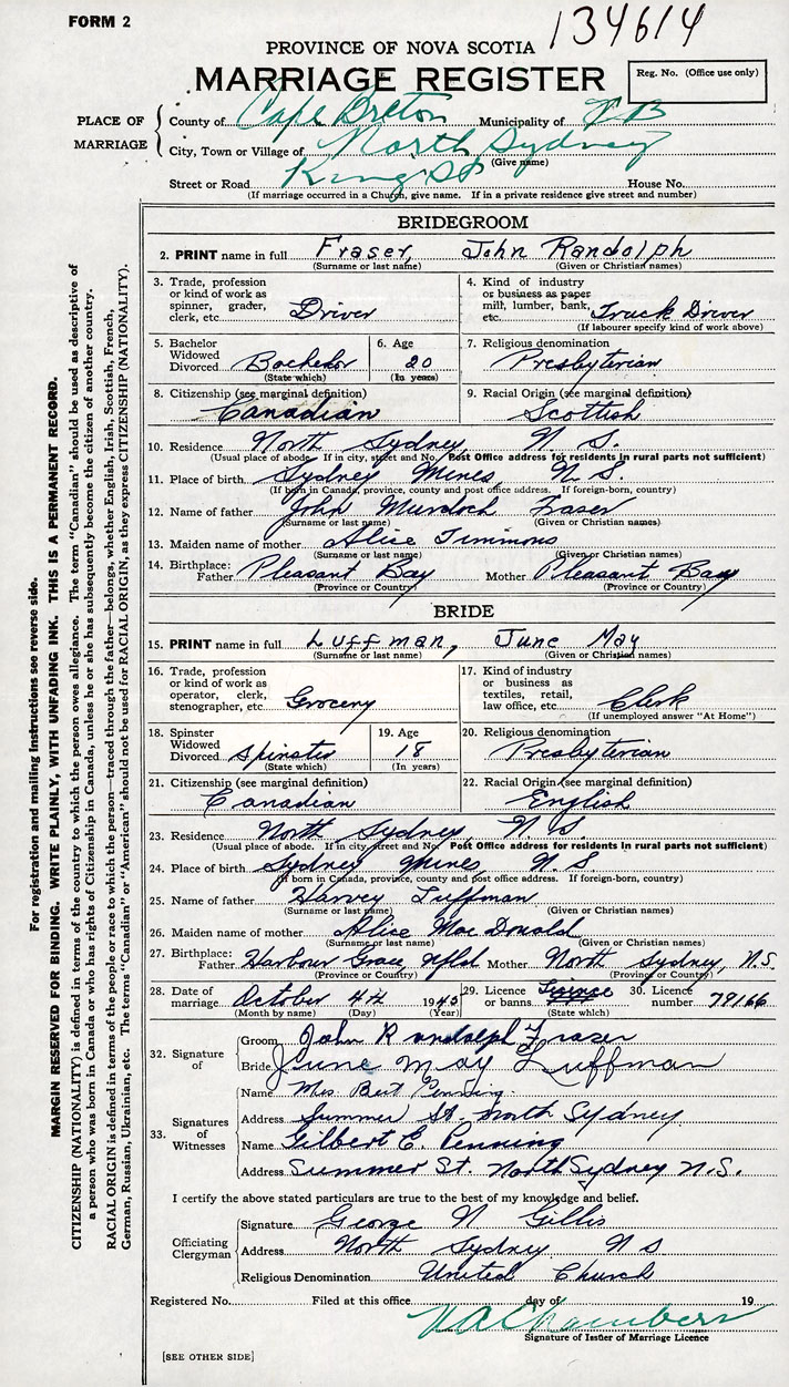 PLACE OF MARRIAGE County of Cape Breton in City or Town North Sydney