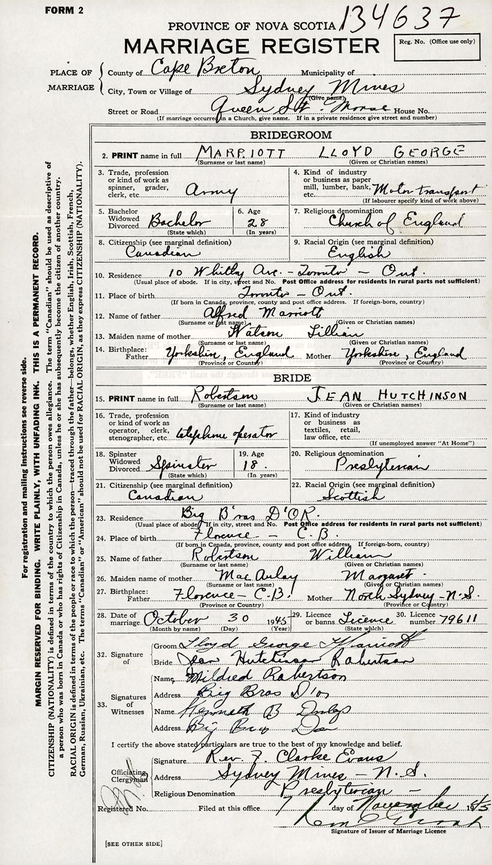 PLACE OF MARRIAGE County of Cape Breton in City or Town Sydney Mines