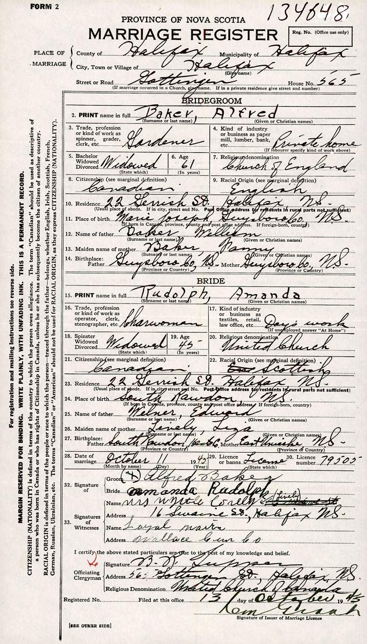 26. Place of marriage 565 Gottingen Street Halifax, Halifax County