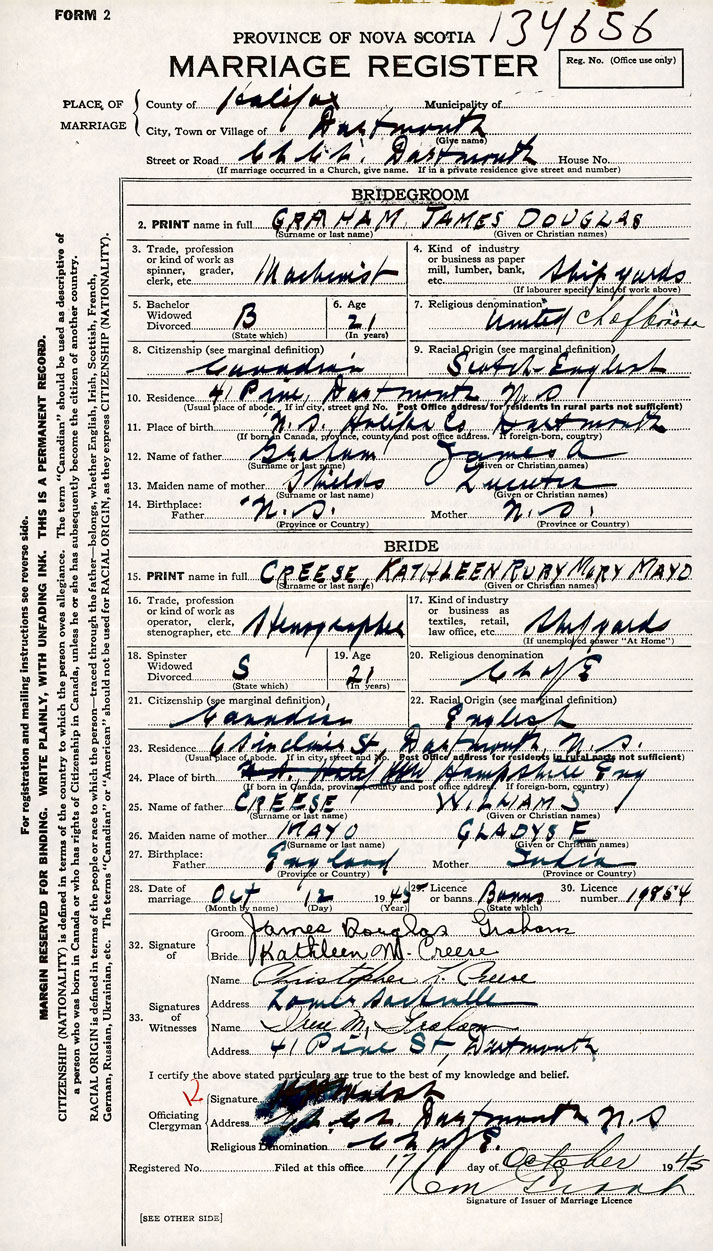 PLACE OF MARRIAGE County of Halifax in City or Town Dartmouth