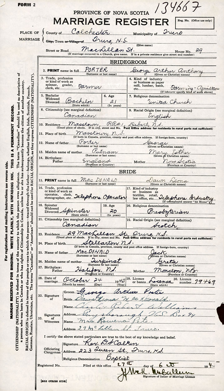 26. Place of marriage MacLellan Street Truro, Colchester County