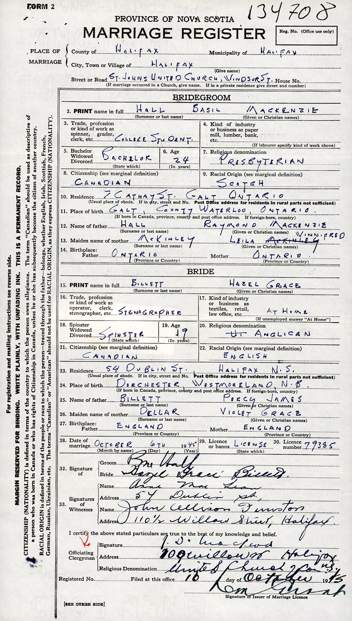 26. Place of marriage St Johns United Church Halifax, Halifax County