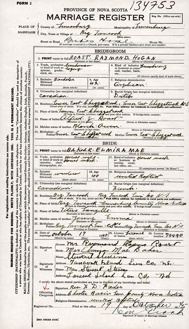 PLACE OF MARRIAGE County of Lunenburg in City or Town Big Tancook