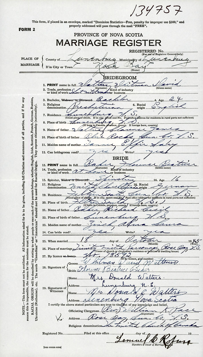 26. Place of marriage Trinity United Parsonage Rose Bay, Lunenburg County