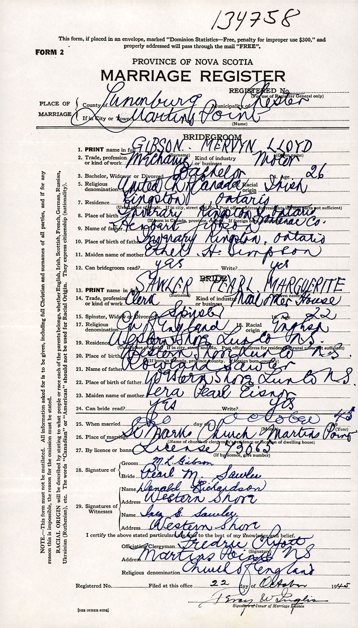 PLACE OF MARRIAGE County of Lunenburg in City or Town Martins Point