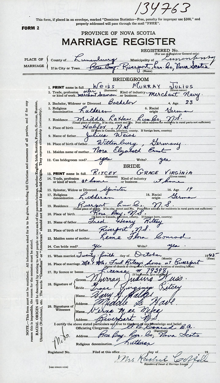 26. Place of marriage Mr. & Mrs. Fred Ritcey's home Riverport, Lunenburg County