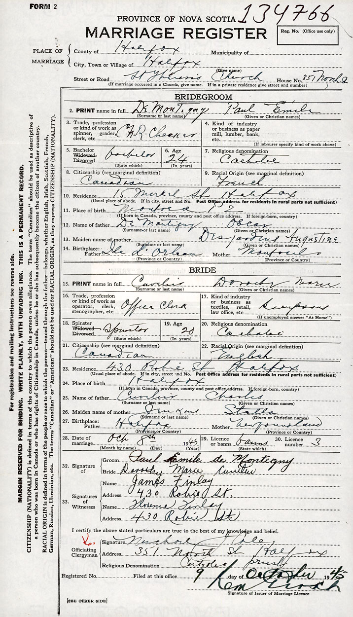 PLACE OF MARRIAGE County of Halifax in City or Town Halifax