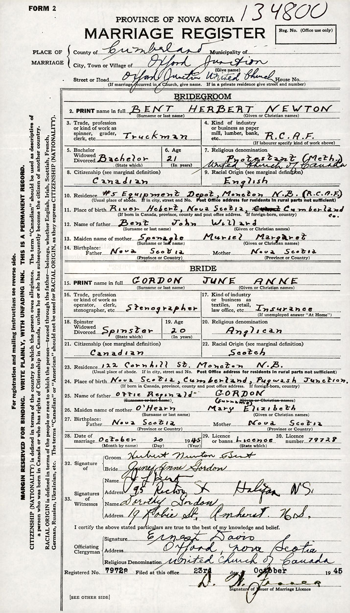 26. Place of marriage United Church of Canada Oxford Junction, Cumberland County