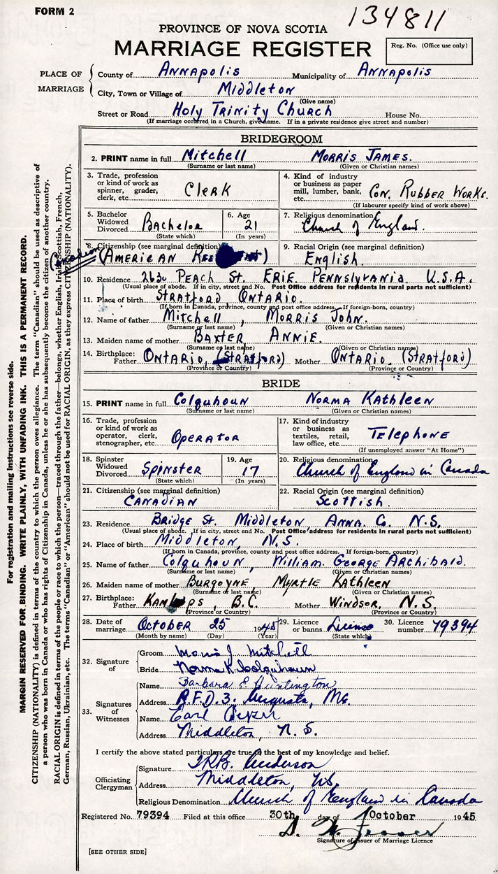 26. Place of marriage Holy Trinity Church Middleton, Annapolis County