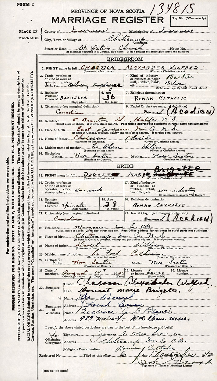 PLACE OF MARRIAGE County of Inverness in City or Town Cheticamp