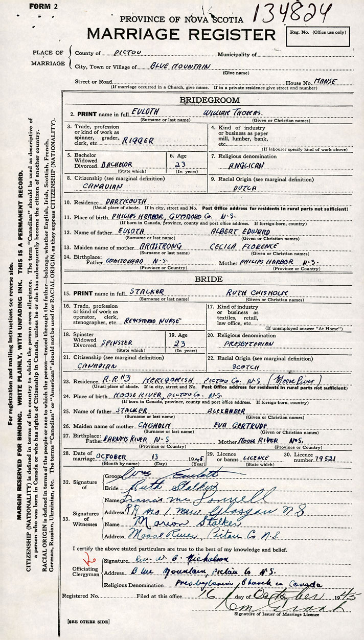 According to a certified copy of the Decree Absolute for Divorce dated 1954-8-25 and filed in the Office of the Registrar General under Divorce number 525, it is ordered that the marriage of William Thomas Euloth and Ruth Chisholm Stalker (Registered under marriage number 1945-134824) be null and void.