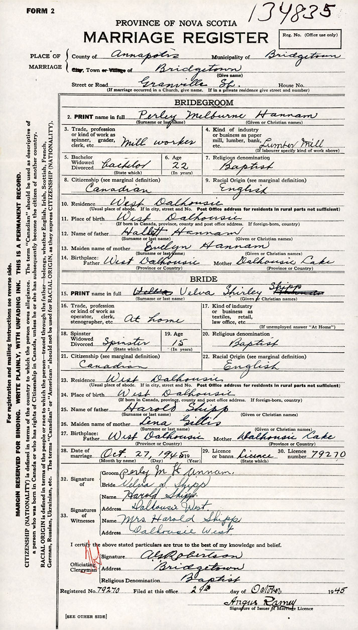 26. Place of marriage Bridgetown, Annapolis County