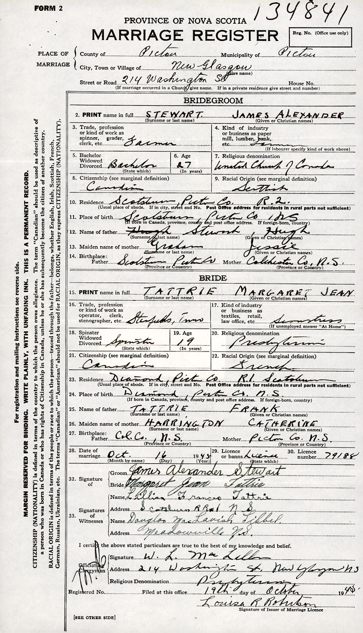 26. Place of marriage 214 Washington Street New Glasgow, Pictou County