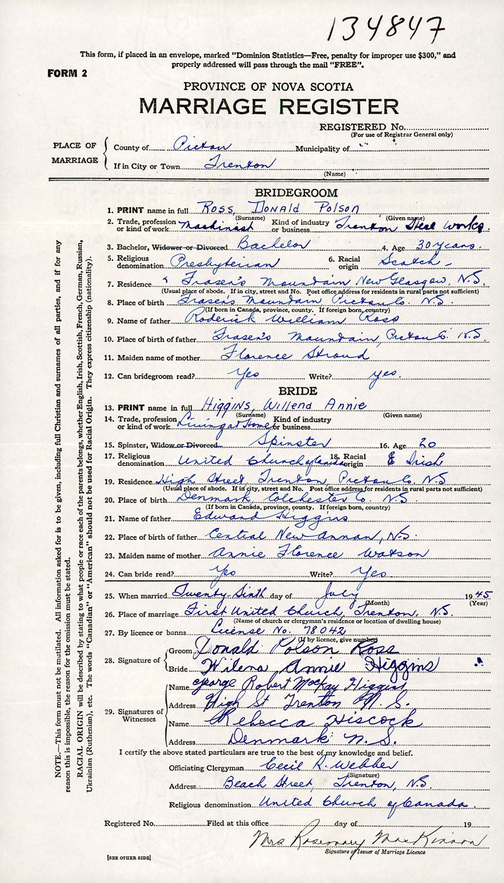 26. Place of marriage First United Church Trenton, Pictou County
