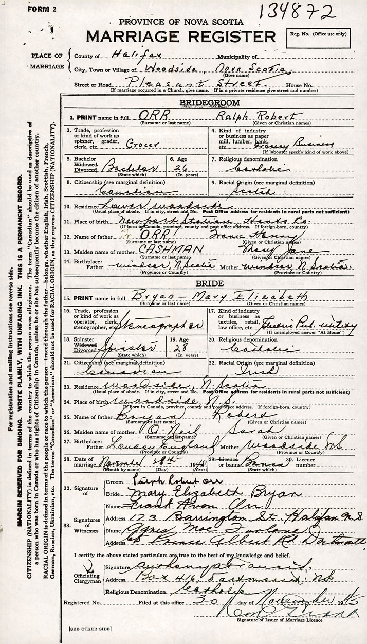 PLACE OF MARRIAGE County of Halifax in City or Town Woodside