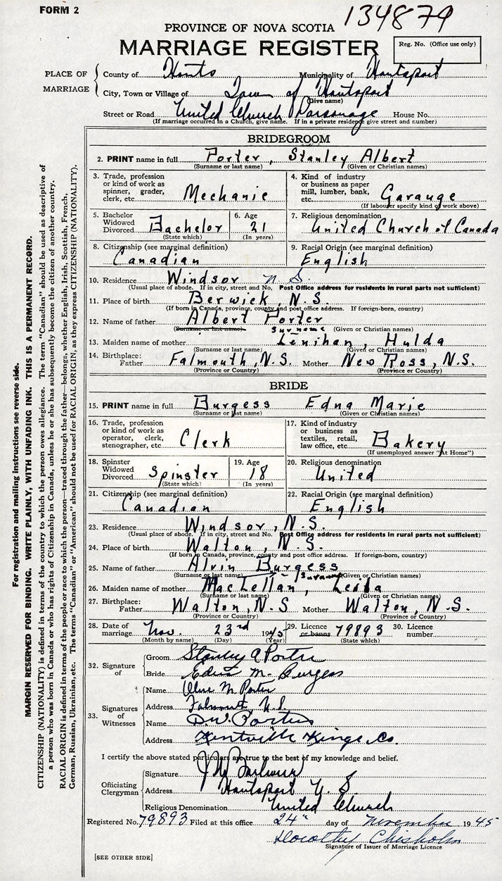 PLACE OF MARRIAGE County of Hants in City or Town Hantsport