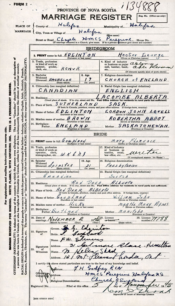 26. Place of marriage Chapel HMCS Peregrine Halifax, Halifax County