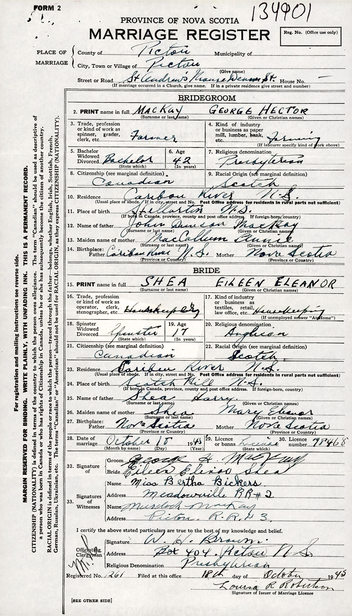 PLACE OF MARRIAGE County of Pictou in City or Town Pictou