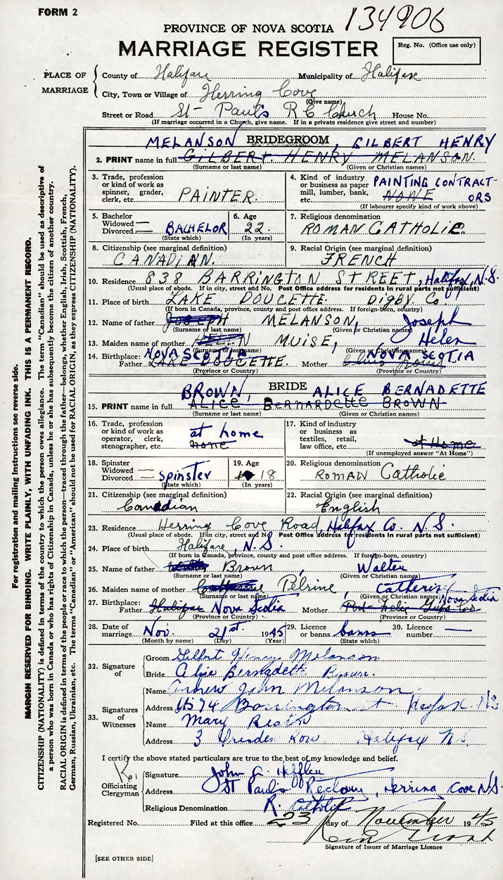 26. Place of marriage St. Paul's Roman Catholic Church Herring Cove, Halifax County