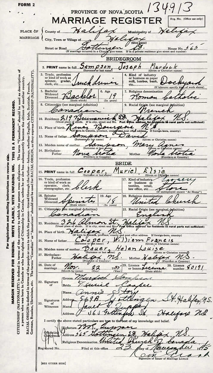 26. Place of marriage 565 Gottingen Street Halifax, Halifax County