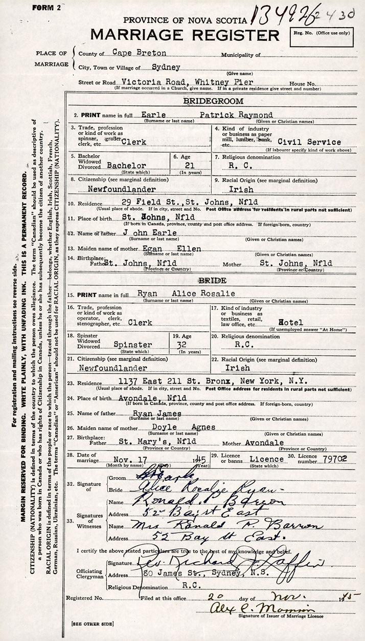 26. Place of marriage Victoria Road, Whitney Pier Sydney, Cape Breton County