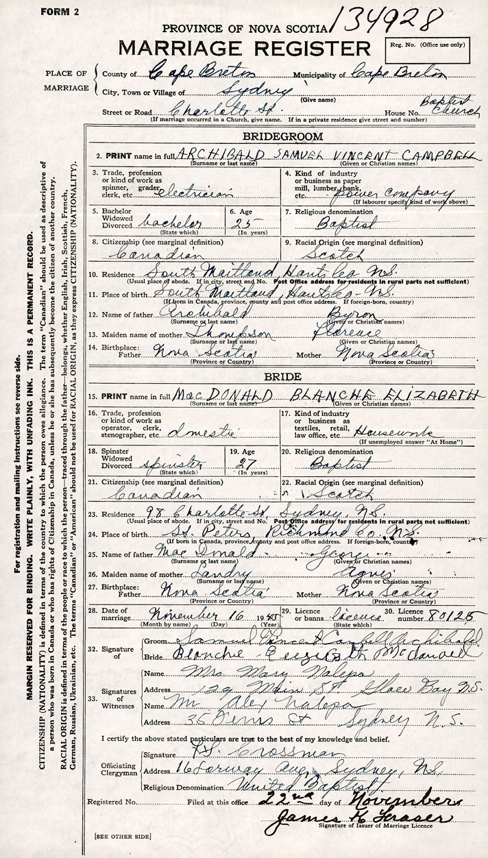 PLACE OF MARRIAGE County of Cape Breton in City or Town Sydney