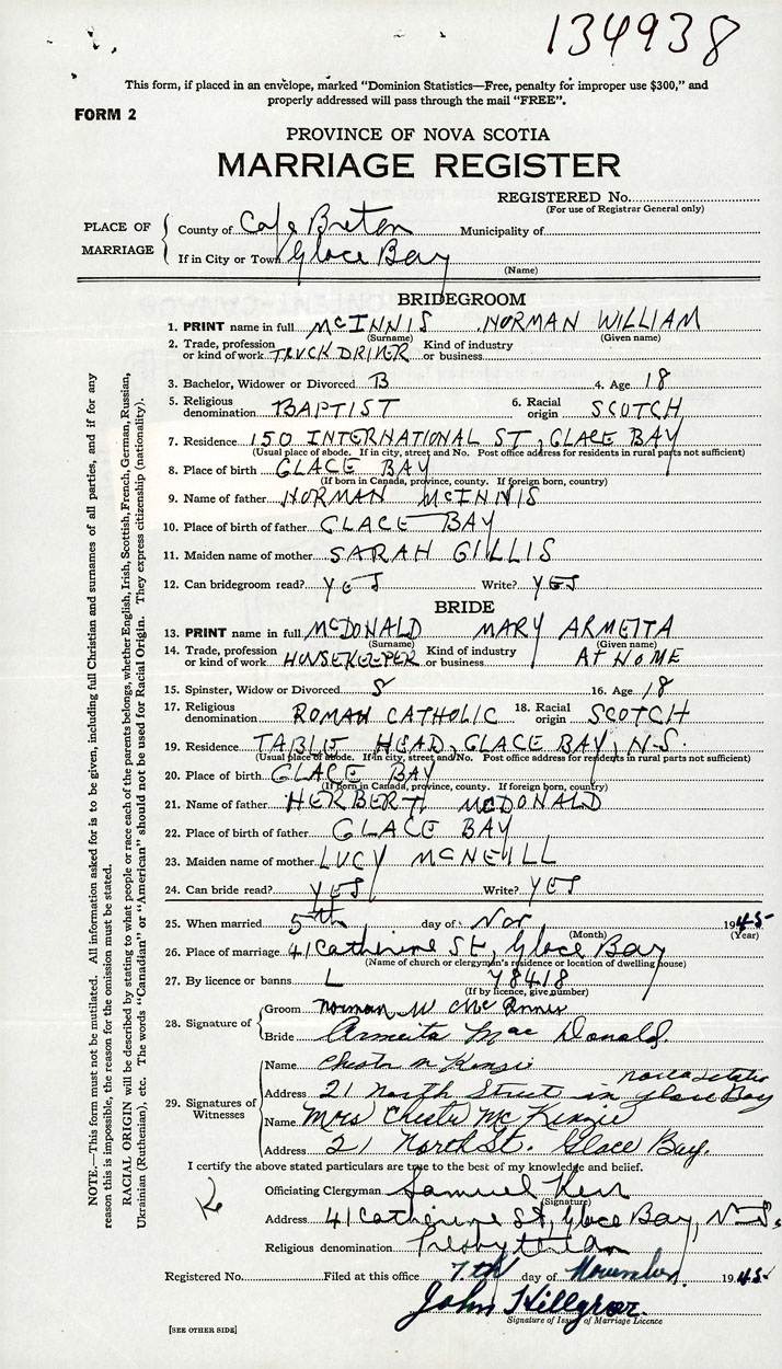26. Place of marriage 41 Catherine St. Glace Bay, Cape Breton County