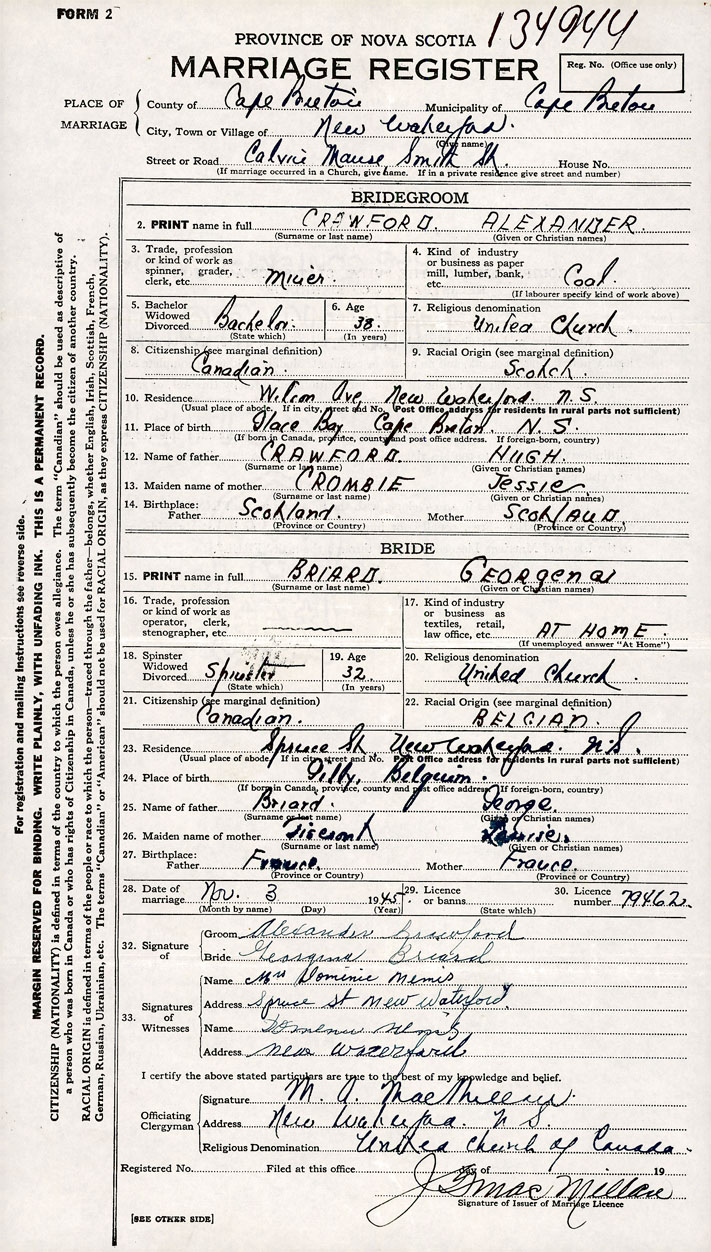 PLACE OF MARRIAGE County of Cape Breton in City or Town New Waterford