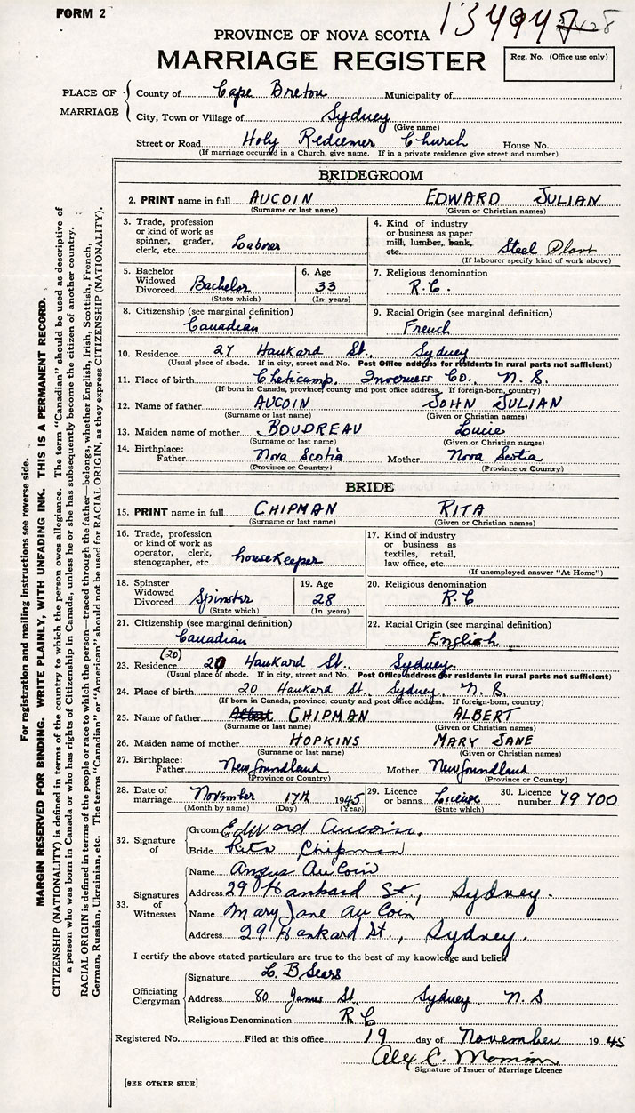 Note: groom's mother born Nova Scotia; bride's mother born Newfoundland