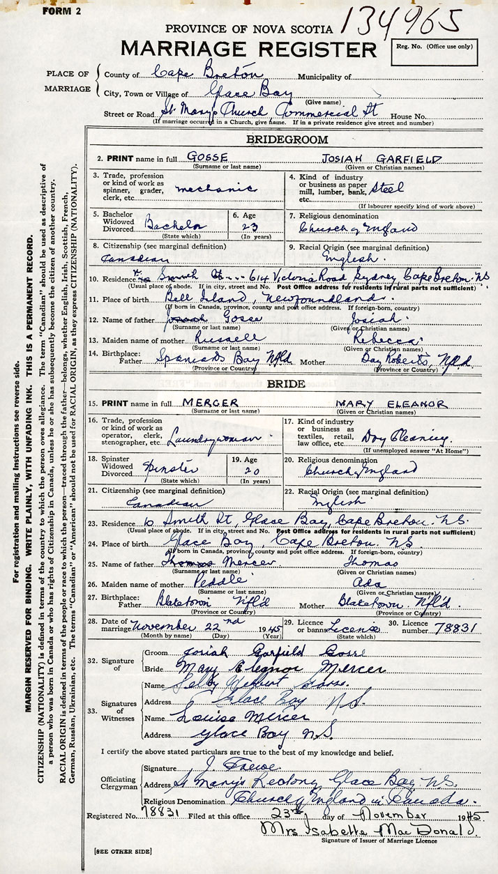 Note: groom's mother born Bay Roberts, Newfoundland; bride's mother born Blaketown Newfoundland