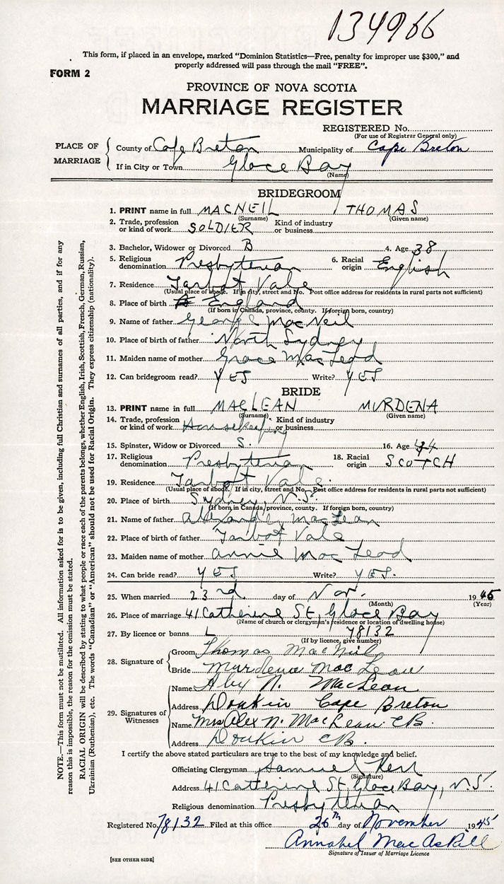 26. Place of marriage 4 Catherine Street Glace Bay, Cape Breton County