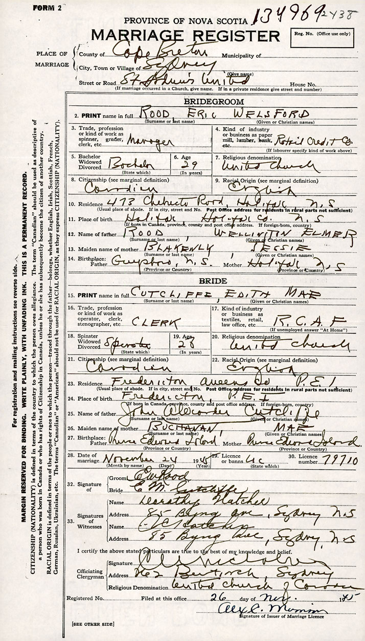 Note: Groom's mother born Halifax; bride's mother born PEI