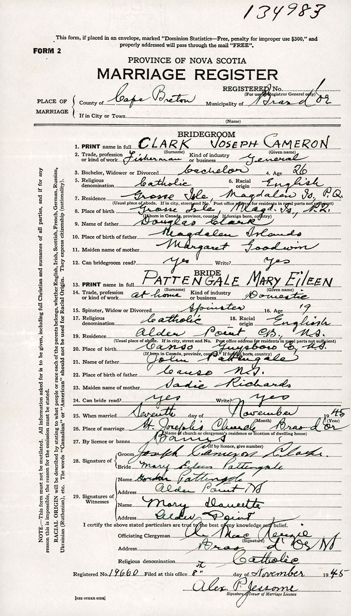 PLACE OF MARRIAGE County of Cape Breton in City or Town Bras D'Or
