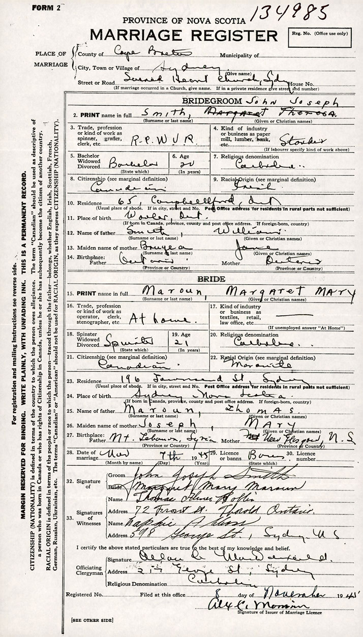 PLACE OF MARRIAGE County of Cape Breton in City or Town Sydney