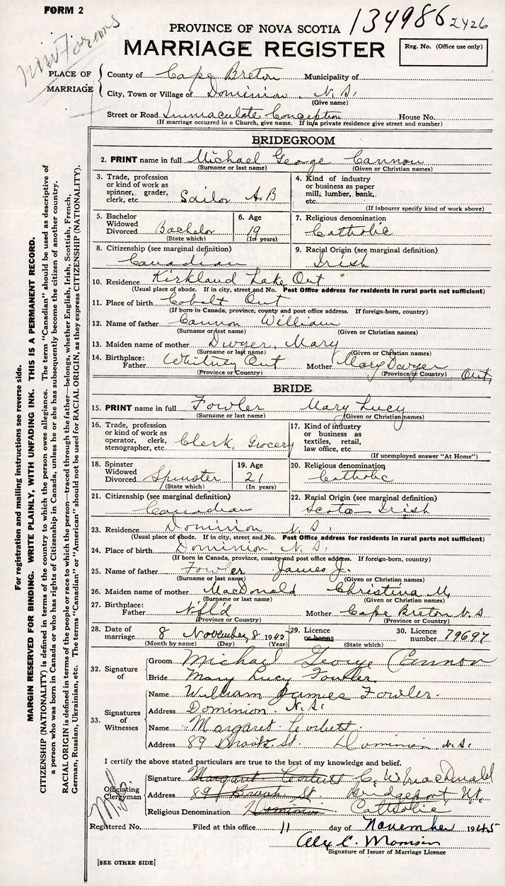 Note: Groom's mother born Ontario; bride's mother born Cape Breton