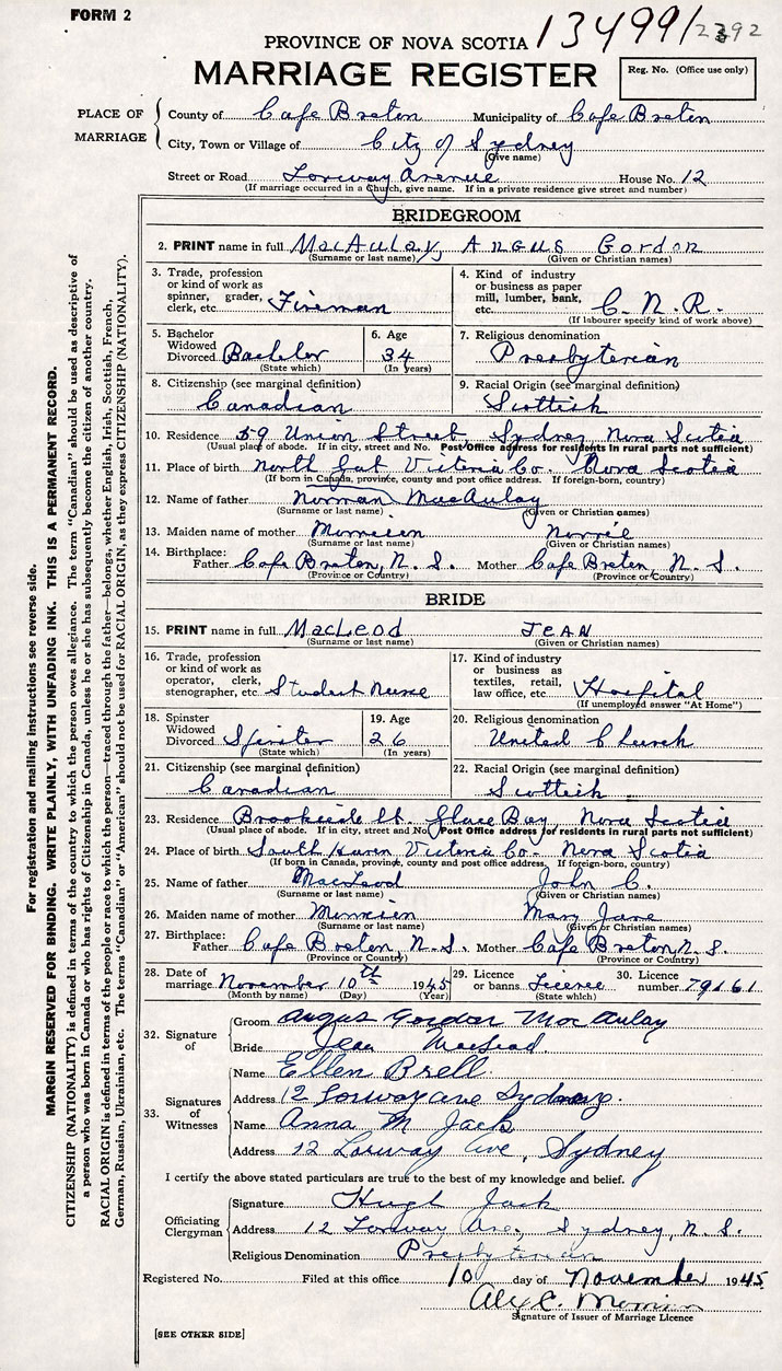 26. Place of marriage 12 Lorway Avenue Sydney, Cape Breton County