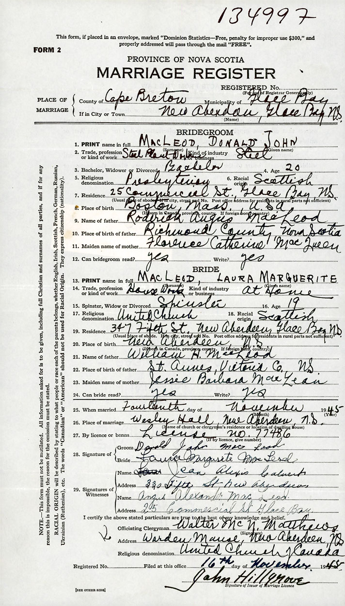 PLACE OF MARRIAGE County of Cape Breton in City or Town New Aberdeen