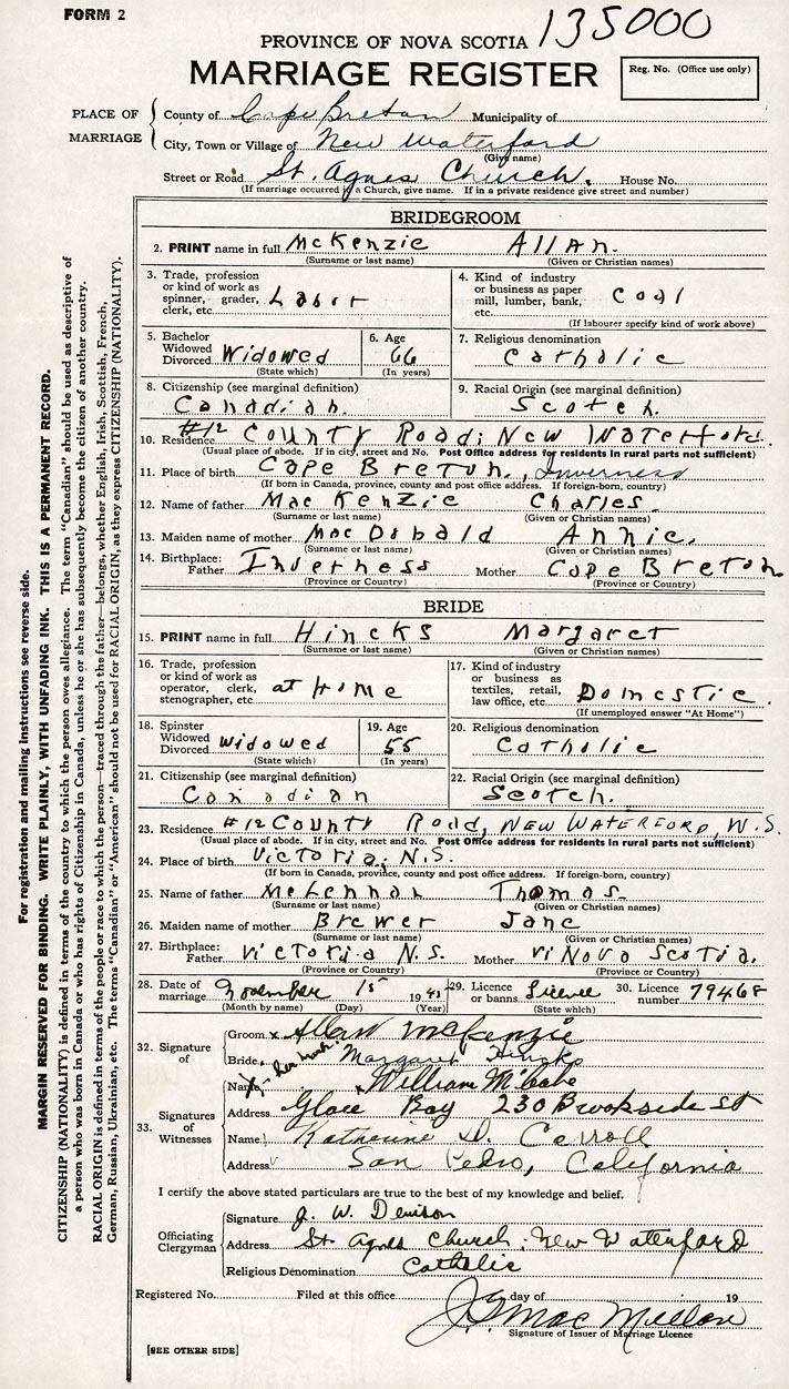 PLACE OF MARRIAGE County of Cape Breton in City or Town New Waterford