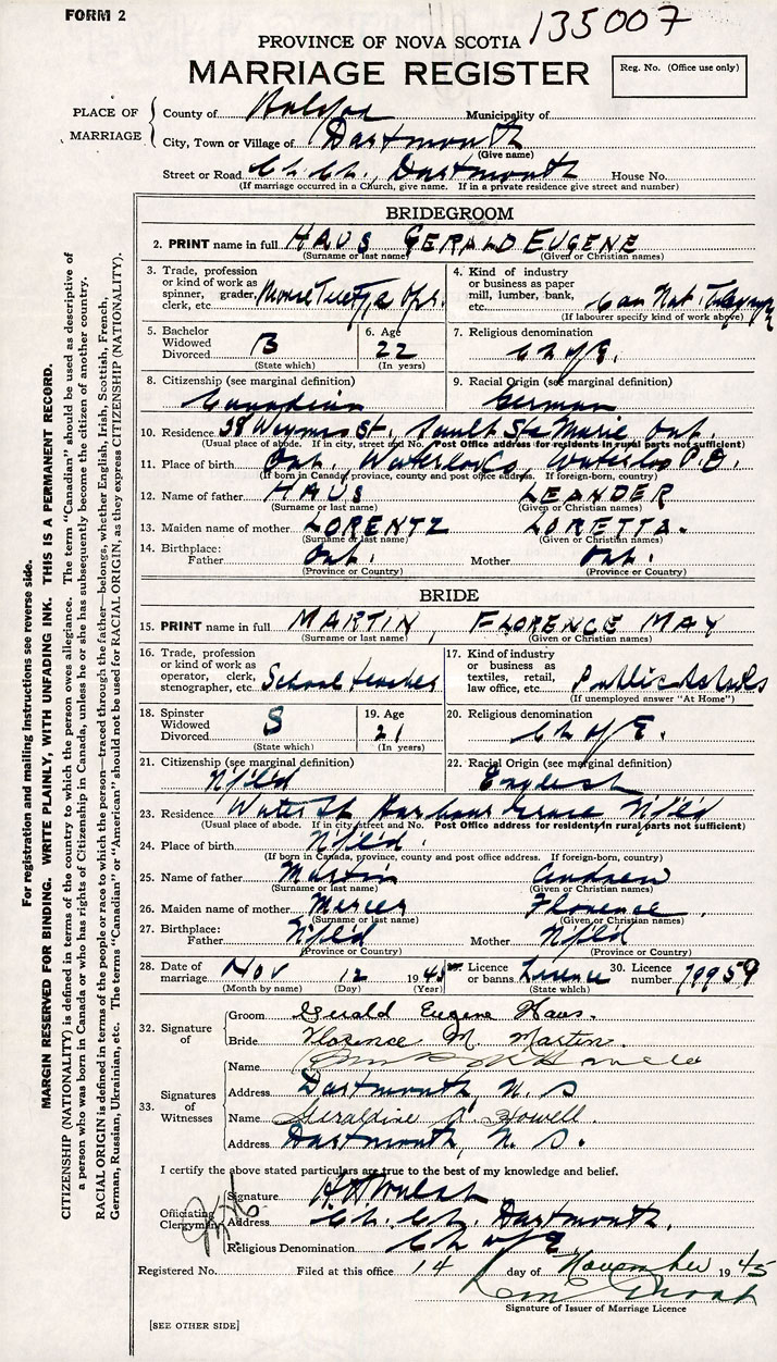 PLACE OF MARRIAGE County of Halifax in City or Town Dartmouth