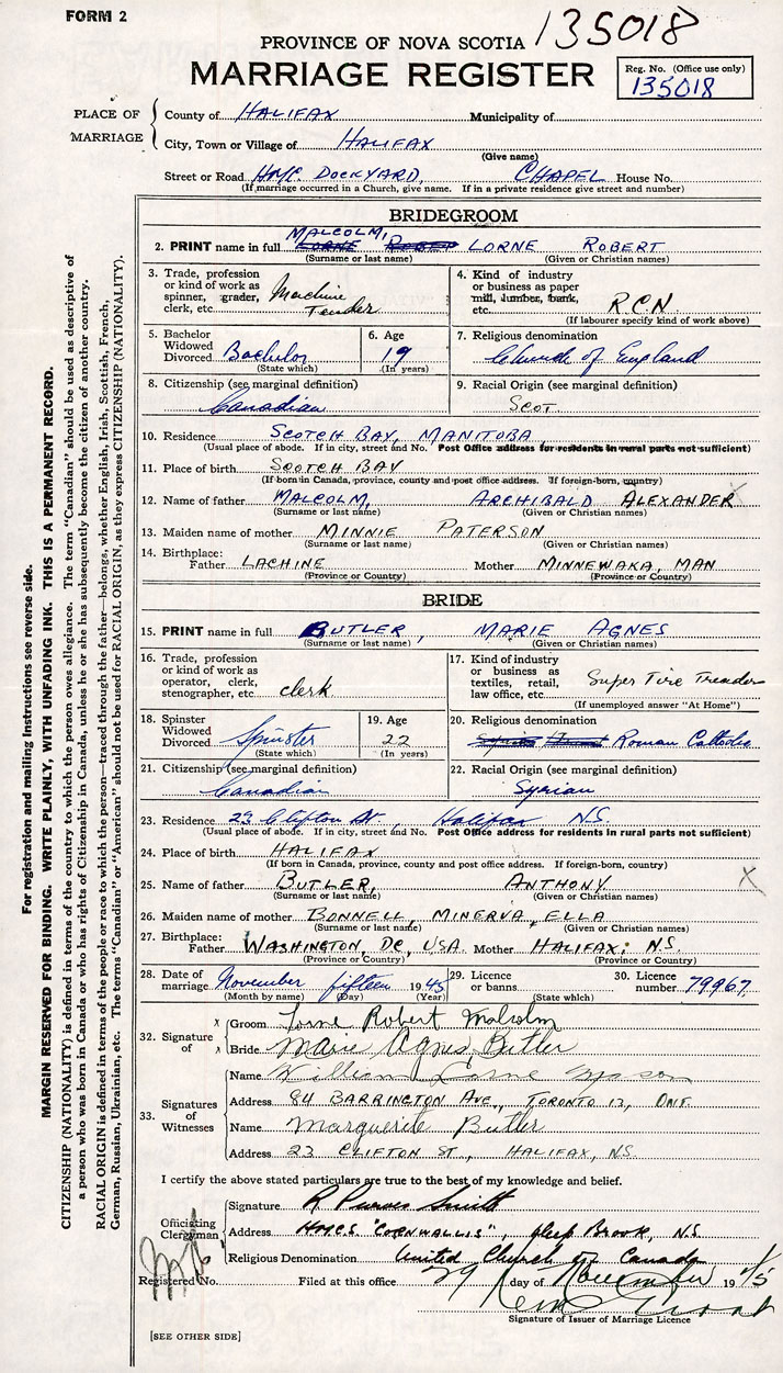 26. Place of marriage M.M.C. Dockyard Chapel Halifax, Halifax County