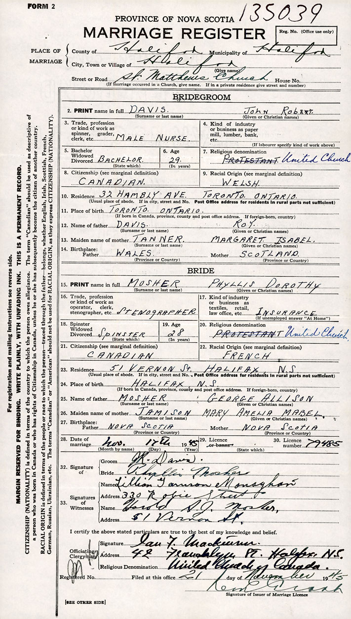 PLACE OF MARRIAGE County of Halifax in City or Town Halifax
