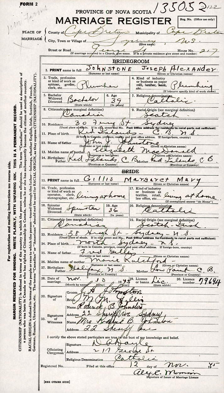 26. Place of marriage 217 George St Sydney, Cape Breton County