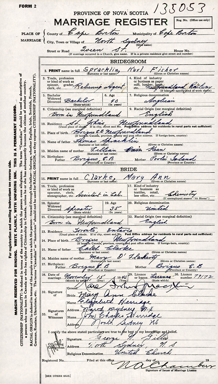 26. Place of marriage Queen Street North Sydney, Cape Breton County