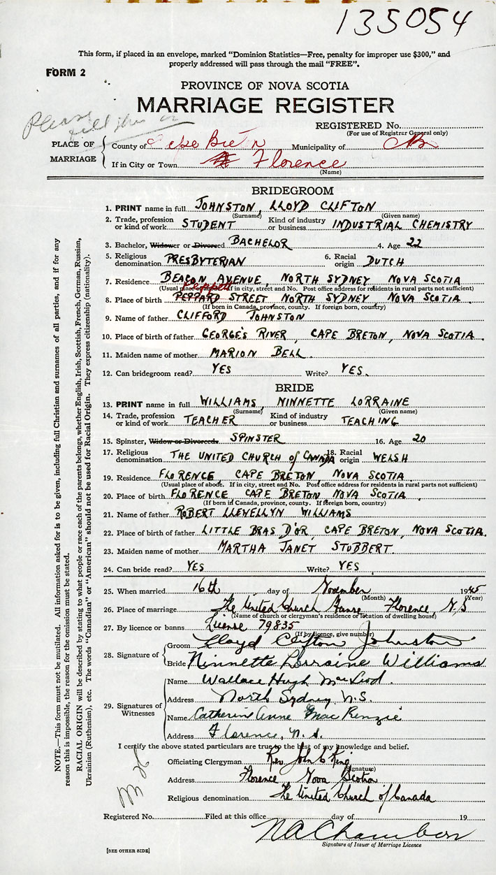 PLACE OF MARRIAGE County of Cape Breton in City or Town Florence
