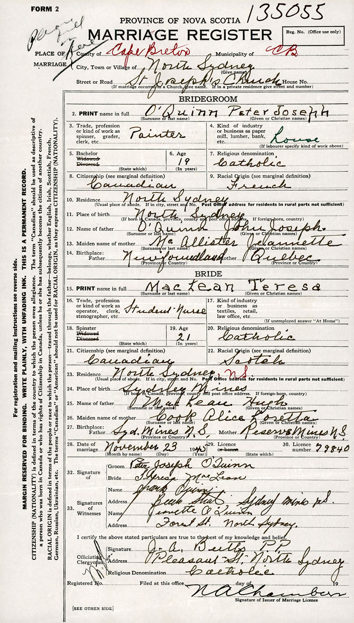 26. Place of marriage St Joseph's Church North Sydney, Cape Breton County