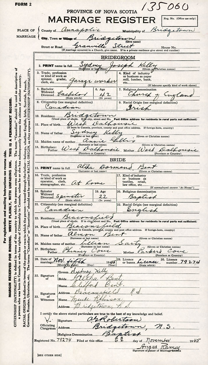 26. Place of marriage Bridgetown, Annapolis County