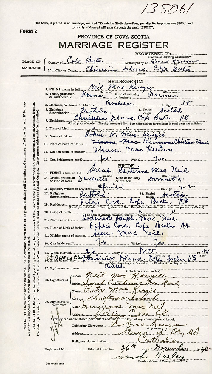 26. Place of marriage St. Barra's Church Christmas Island, Cape Breton County