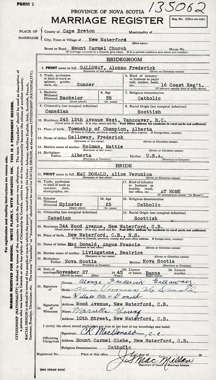 PLACE OF MARRIAGE County of Cape Breton in City or Town New Waterford