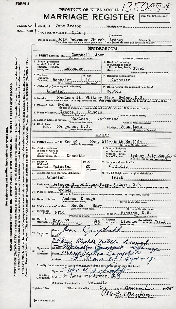 26. Place of marriage Holy Redeemer Church Sydney, Cape Breton County